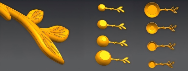 Lehenik eta behin, produktuaren forma eta erabilera potentziala aldez aurretiko esperientzian oinarrituta ebaluatu zen. Zink aleazioa lehen material gisa erabilita, materialaren dentsitatea eta gainazaleko ezaugarriak kalkulatu genituen, ergonomia sartu genuen eta lau koilara neurtzeko edo izotz koilareen dimentsio orokorrak diseinatu genituen. Ondoren, kurba bakoitza, R erradioaren angeluak eta eskala txikiko beste xehetasun batzuk findu genituen.